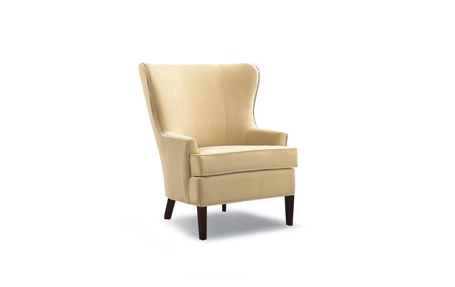 Ce fauteuil à oreilles à dossier tonneau arbore une silhouette majestueuse. La bordure cloutée le long de la structure supérieure ajoute une touche d'élégance. Construction écologique. Structure en bois séché au four certifié durable. Mousse polyuréthane à base de soja MicroGel enveloppée d'un mélange de plumes. Système de ressorts à fil sinueux.
