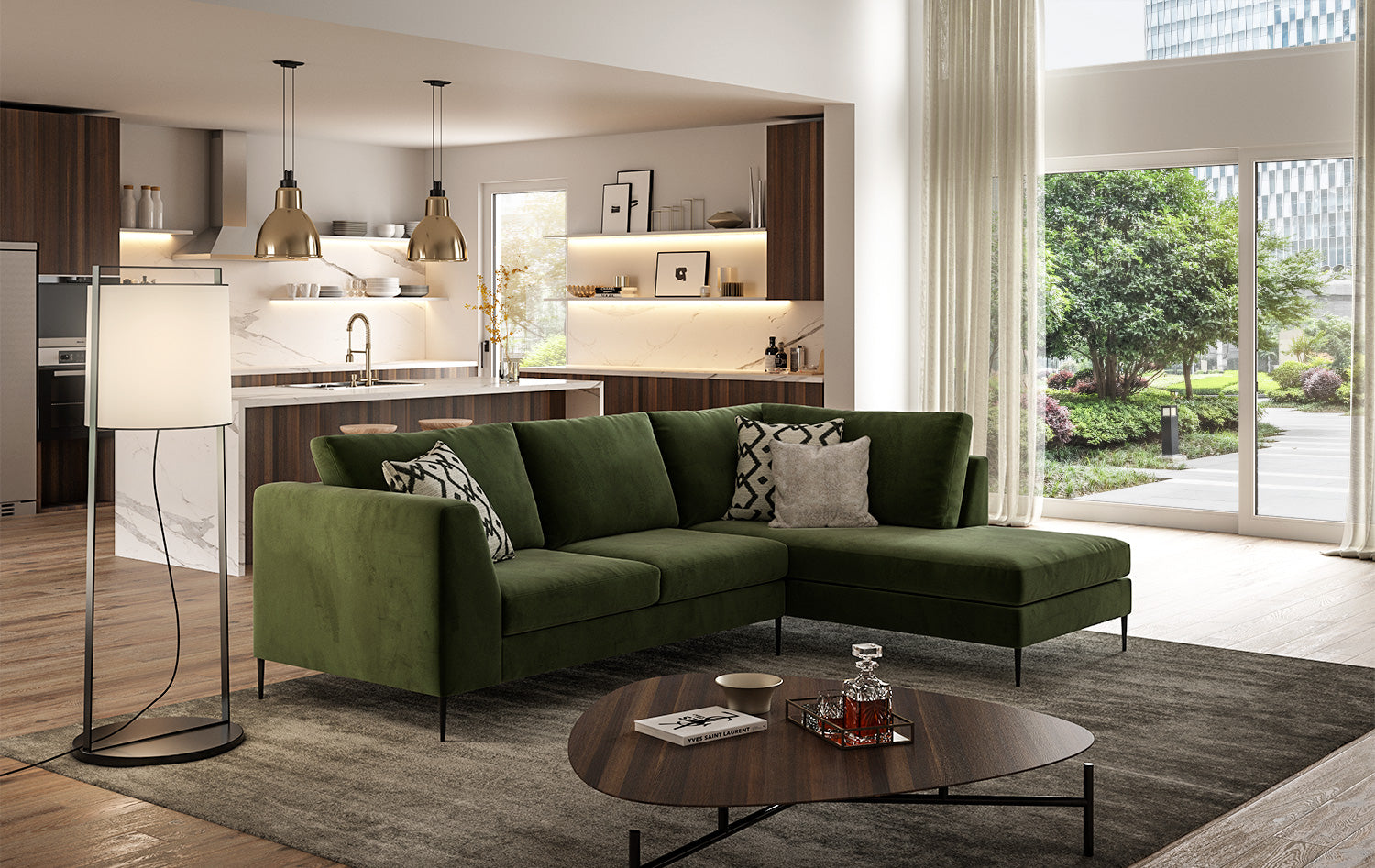 Grâce à ses accoudoirs larges et inclinés, cette collection de canapés modulaires tendance est un incontournable du design moderne. Dossier à coussins amovibles. Construction écologique. Structure en bois certifié durable, séché au four. Mousse de polyuréthane MicroGel à base de soja avec revêtement en fibres. Système de ressorts à fil sinueux.