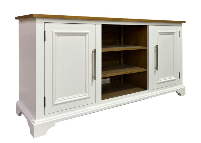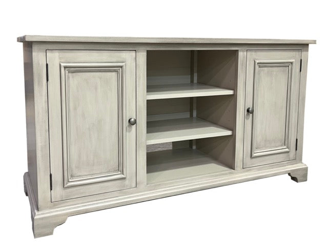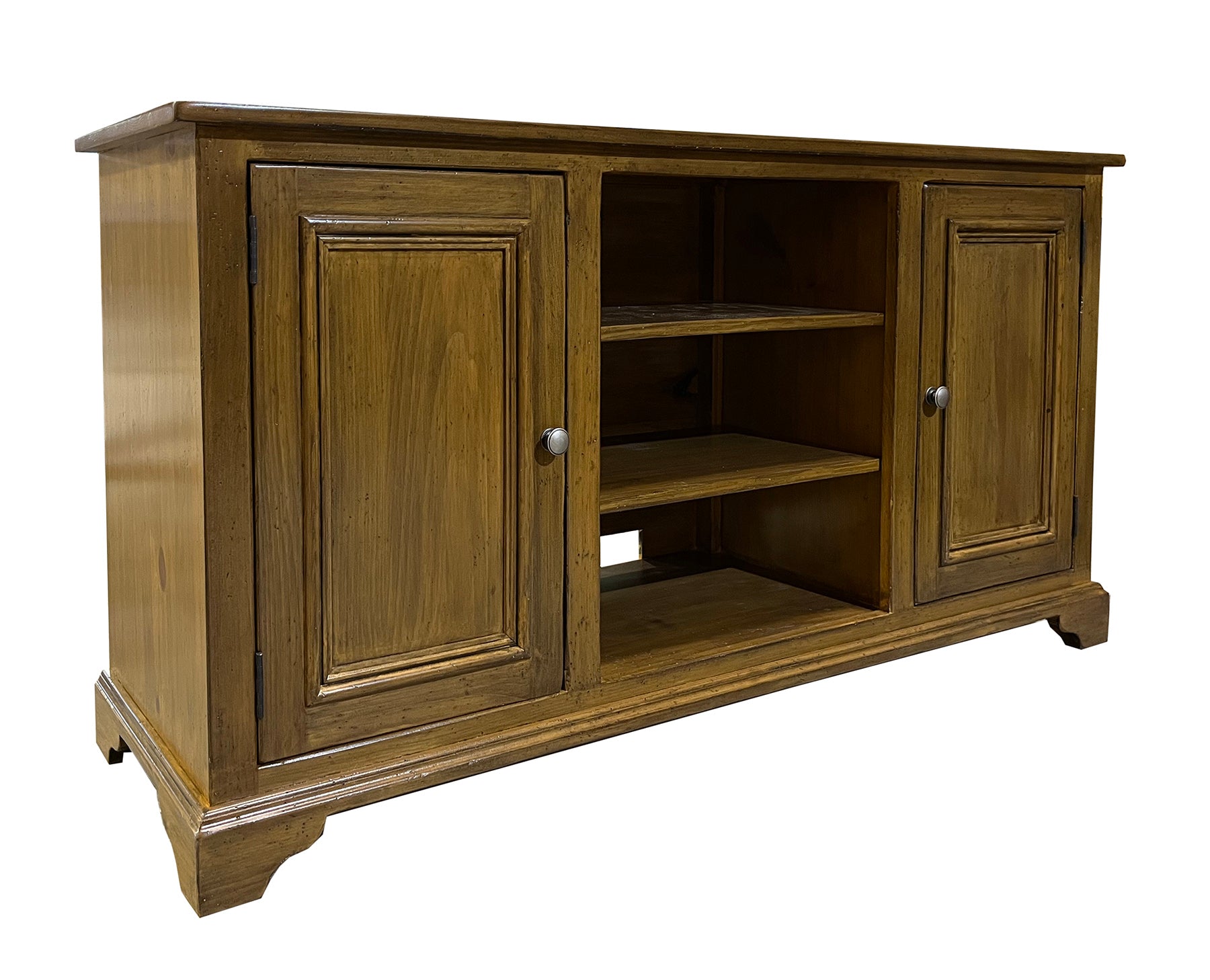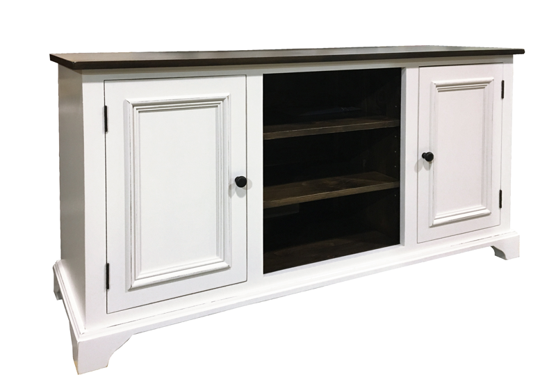 The Brome Lake TV stand includes two storage cabinets as well as open, adjustable shelves for your electronic devices. It is made of solid wood and has a hole in the center of the back panel for cable management.