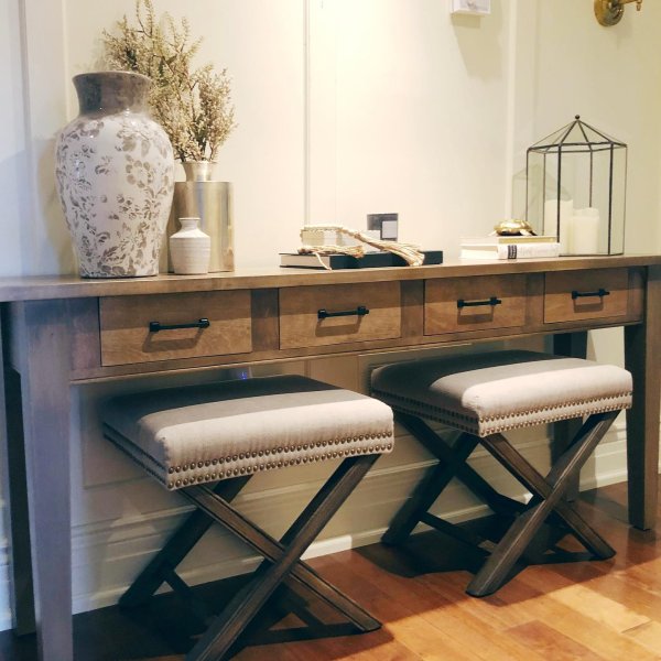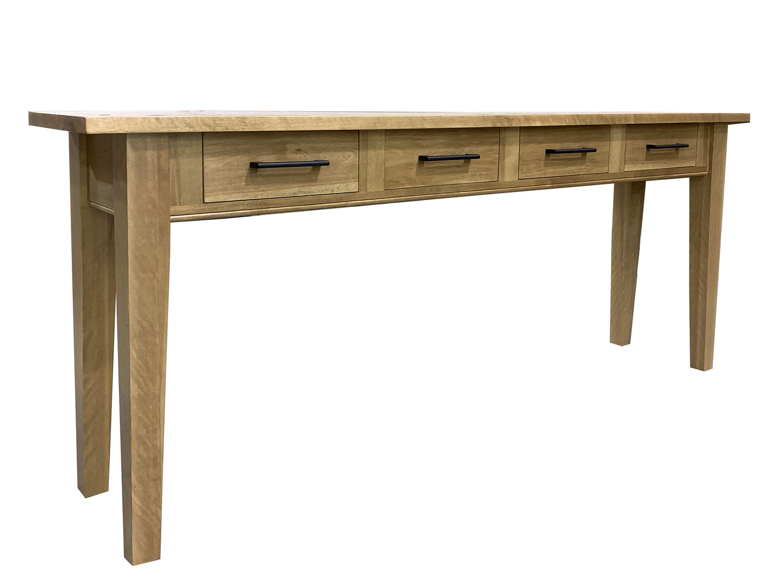 The Cambridge Hall Table blends traditional craftsmanship with transitional design, making it a versatile addition to any room. Crafted from solid hardwood, its clean, simple form allows it to fit seamlessly into both classic and contemporary spaces—whether placed in a front hallway, behind a sofa, or in a den or office. Its long, narrow proportions (74” wide and only 14” deep) make it ideal for tight spaces, while full-extension drawer glides ensure easy access to everyday items. The piece transforms dramatically depending on your chosen finish: a full paint lends it a crisp, modern edge, while a stain highlights the natural warmth of the wood. Pewter knobs are included by default, but hardware can be customized to suit your décor. Dimensions: 74” W x 14” D x 30” H