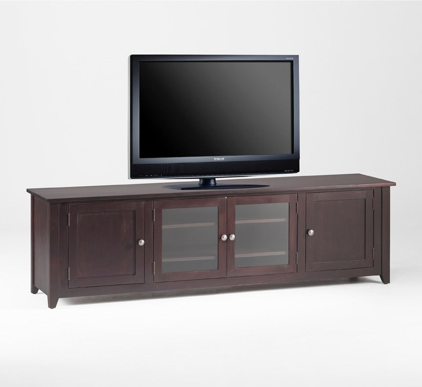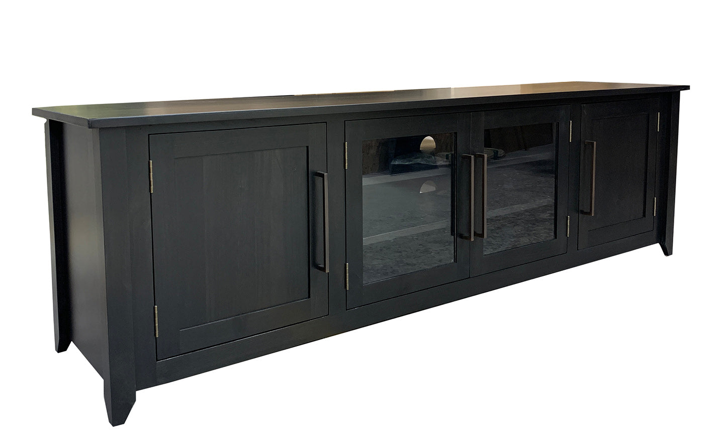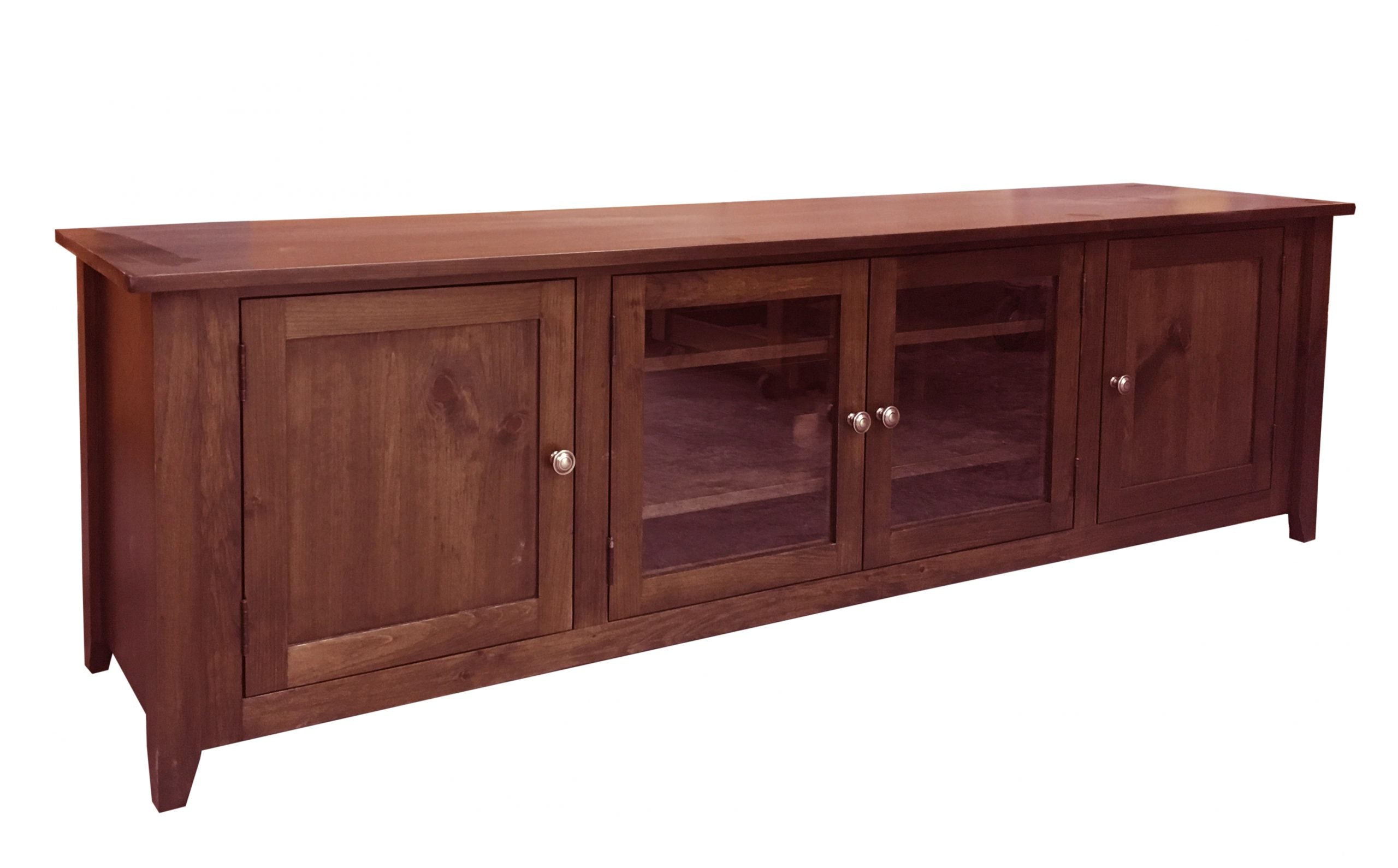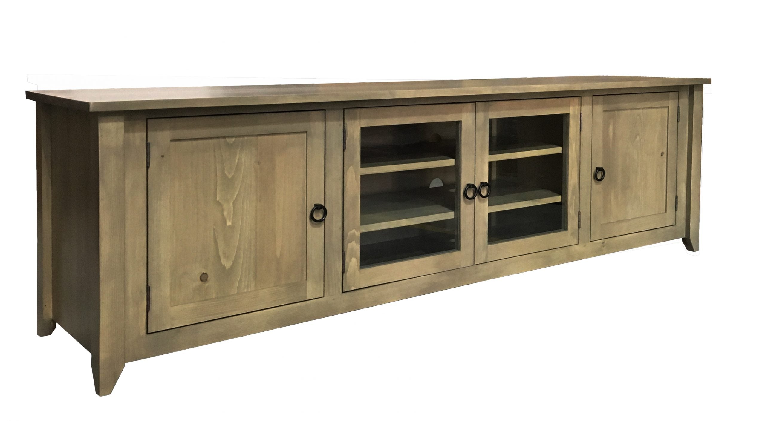 Classic form meets contemporary function in the Cambridge TV Stand—a versatile media console designed to suit both traditional and transitional interiors. Made predominantly from solid pine, this substantial piece offers generous storage with a clean, streamlined look. Two glass-panel doors reveal adjustable shelves for media components, books, or display items, while two solid-panel doors conceal additional storage to keep your space organized and clutter-free. The expansive top surface easily accommodates TVs of all sizes, and the option for a contrasting finish on the top adds a tailored, custom touch. Default hardware includes classic wood knobs, though alternate selections are available for a more personalized look. Dimensions: 82” W x 19½” D x 24” H Interior: 2 adjustable shelves per section