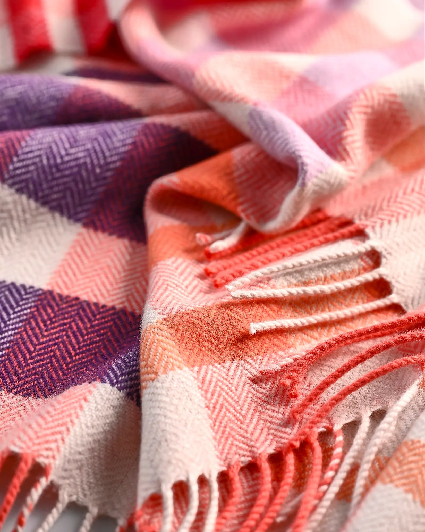 The Doll baby blanket is woven in a soft and lightweight cashmere blend. Just the thing for keeping your little bundle snug as a bug for naps or adventures in the buggy and designed in a playful multicoloured gingham style check and herringbone adorned in warm berry shades
