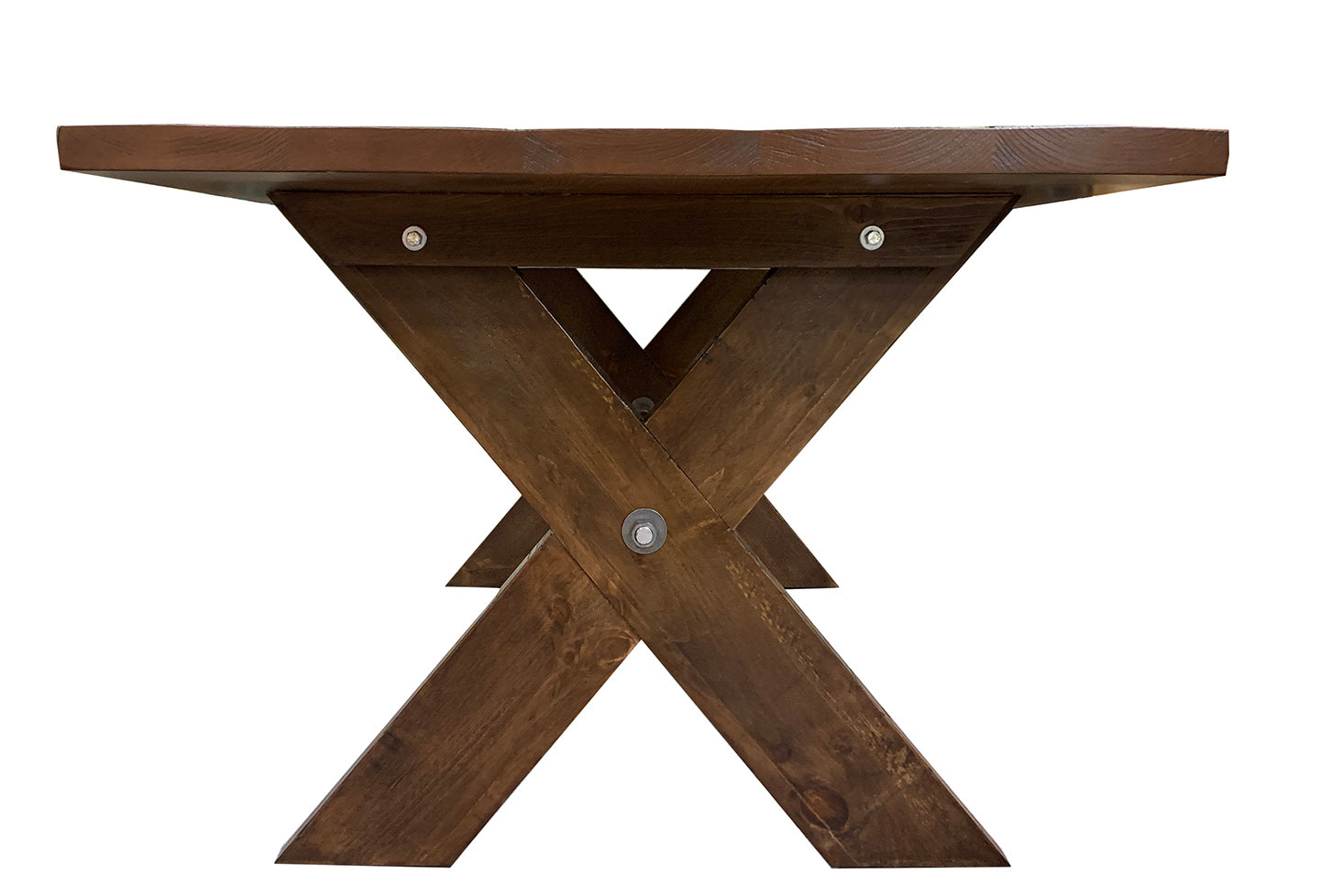 Raw, rugged, and right at home in urban lofts or modern farmhouses, the Dunham Sawbuck Table is a bold blend of industrial and rustic design. Built entirely from rough-hewn pine, its textured surface carries the marks of honest craftsmanship, offering a raw, tactile look reminiscent of reclaimed timber. A black 1” metal pipe runs through the trestle base, mortised through the legs and fastened with visible nuts—adding both structural strength and industrial character. Available in 5', 6', 7', or 8' lengths, this table is designed with thoughtful proportions: each pedestal base is inset 11” from the ends to allow for comfortable end seating. Finished in satin acrylic polyurethane for durability and an understated sheen, the Sawbuck Table is best suited to one of our stain finishes, which accentuate the grain and character of the rough-cut wood. Standard Size: 72” L x 36” D x 30” H (custom lengths available) Details: Rough pine; 1" black metal pipe trestle; table ships flat and requires assembly