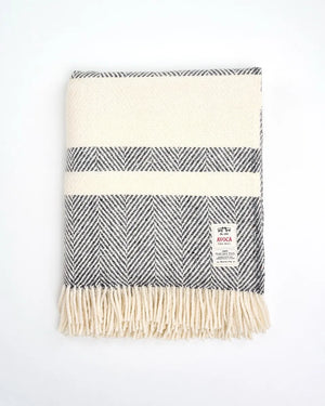 Heavy Donegal Wool Throw Grey Stripe 56x72. This grey throw blanket features cream stripes and herringbone weave that adds texture to your home décor. The wool throw blanket measures 56x72 inches, giving you good coverage for your bed, sofa, or favourite reading spot.