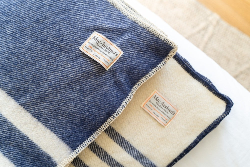100% Virgin Wool Throw Navy Blue with Natural White 52x76. This navy blue throw blanket features clean white stripes that add contrast to your home décor. The dark blue throw blanket measures 52x76 inches, making it a good size for your bed, couch, or anywhere you want extra warmth.